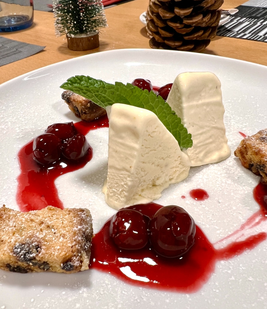 mögen Sie gerne Süßes? Unser aktuelles Monats-Dessert ist sehr zu empfehlen: hausgemachtes Tonkabohnen-Parfait mit Glühwein-Kirschen & Stollen-Croutons.