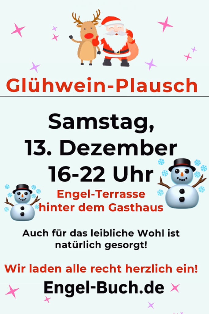 Auf unserer Engel-Terrasse hinter dem Gasthaus erwarten Sie unser Glühweinstand sowie einige Aktionen. Für das leibliche Wohl ist selbstverständlich auch gesorgt.